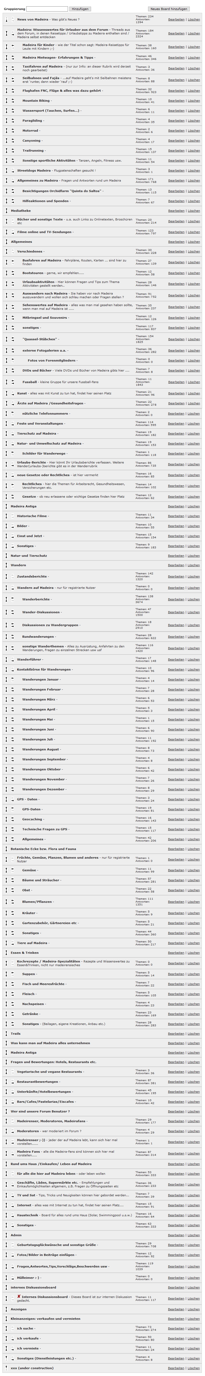 Zur Planung empfiehlt es sich jeweils, die bestehende Boardstruktur auszudrucken und die geplanten Veränderungen dann händisch einzuzeichnen. Das ist dann nicht nur vorteilhaft für die Planung, sondern auch für den Fall, daß sich eine Umkonfigurierung nachträglich als doch nicht so pralle herausstellt. Hilfreich ist dann auch, vor größeren Aktionen auf dem Server jeweils ein BackUp zu erstellen, das war nebenbei grad bei den Problemen mit den PN's wertvoll, als wir dann wußten woran es lag brauchten wir -in dem Falle Jens, weil er dann doch eher Ahnung hat, wo er das finden könnte- "nur" die entsprechende alte Programmzeile herauskopieren und in das aktuelle Verzeichnis einsetzen. edit: wobei "nur" bedeutet, daß man erstmal wissen muss, wo man suchen sollte, und dann natürlich auch noch finden muss- dazu braucht's dann aber schon einen Fachmann.