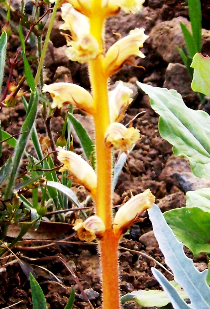 vielleicht noch ein kleiner Hinweis, auch an alle anderen hier. Übersichtsaufnahmen sind auf jeden Fall sinnvoll, da man unter Anderem einen Hinweis auf die Wirtspflanze bekommen kann (in deinem Fall scheint es die Drüsige Wolldistel Andryala glandulosa in der Subspecies varia zu sein). Bei den Sommerwurzen sollte man aber auch immer die Blüten so nah wie möglich aufs Bild bekommen, sowohl von vorne als auch von der Seite (wegen der Farbe der Narben und der Behaarung der Blüten). Und am besten noch eine Blüte abpflücken und zu Hause abmessen (falls man im Gelände kein Lineal zur Hand hat ).