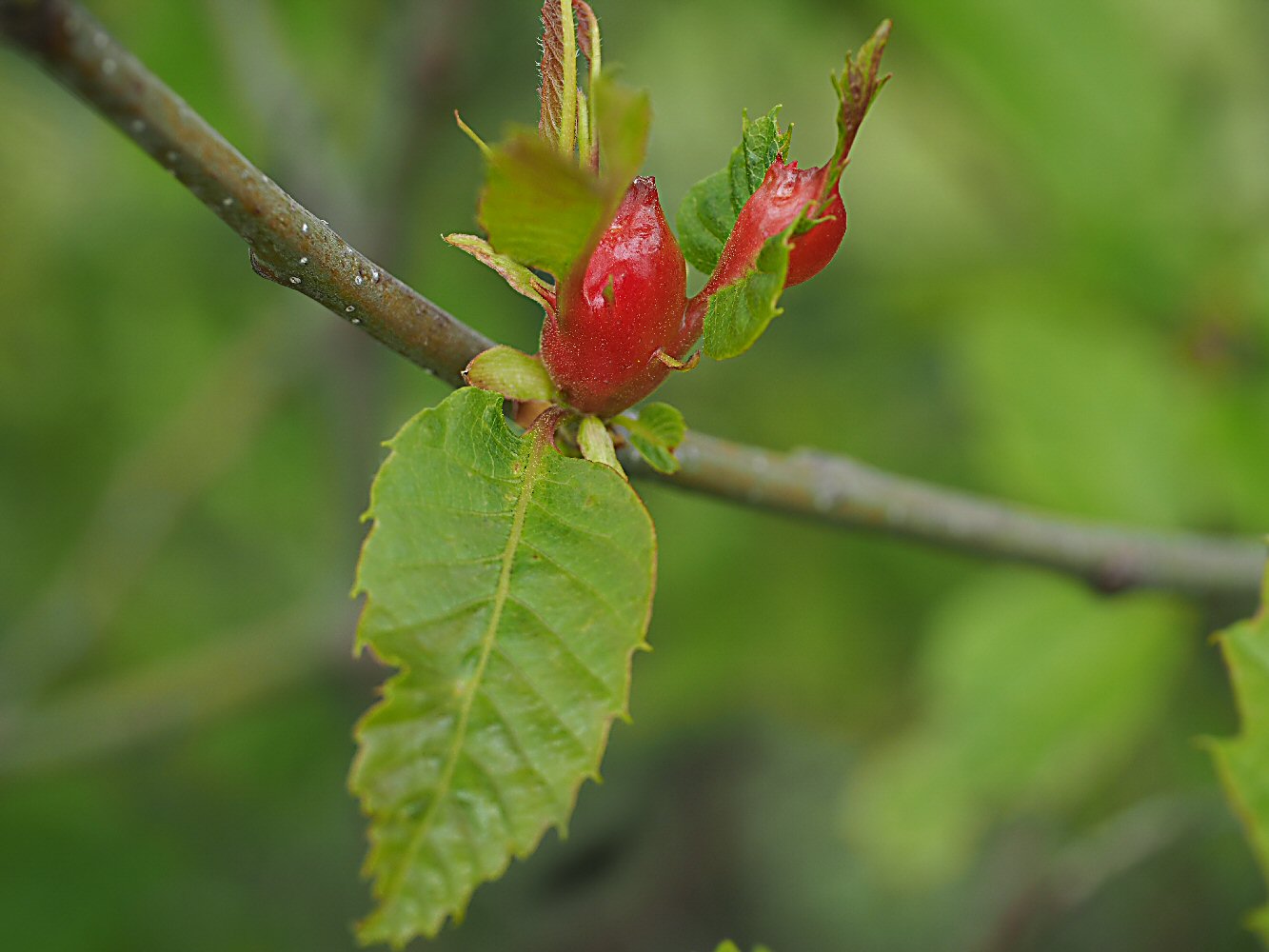 Zunächst aber zeige ich einen Parasiten, der dort auf dem Weg an fast allen Neuaustrieben von Castanea sativa zu finden war. Weil er so auffallend rot ist, werden ihn vermutlich auch andere bereits gesehen, fotografiert und identifiziert haben.