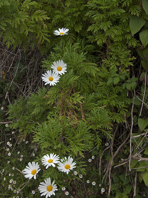 Zur Unterscheidung: die Gefiederte Margerite besitzt - im Gegensatz zum Namen - keine gefiederten sondern nur mehr oder weniger tief eingeschnittene Blätter, während die der Schlitzblättrigen hingegen deutlich fiederteilig sind (manche Sachen muss man halt einfach so hinnehmen). Darüber hinaus ist die Gefiederte Margerite viel reichblütiger. Ein einzelner Blütenstand kann bis zu 30 Blütenköpfchen besitzen, während es bei der anderen Art höchstens fünf sind (auf dem Foto sind zumindest zwei Blütenstände zu sehen).