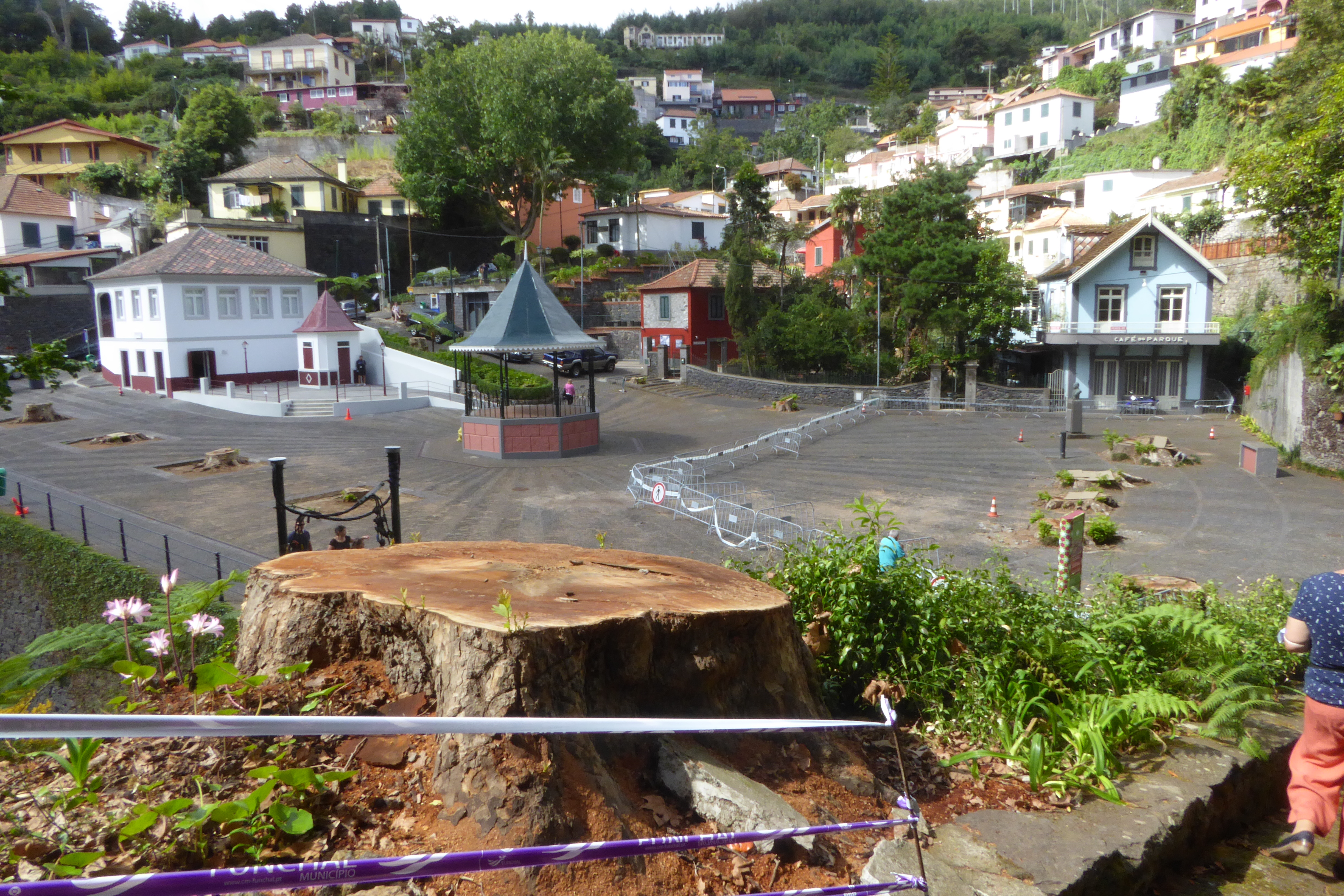 Hallo Wissende, als wir vor zwei Jahren ds letzte Mal auf Madeira waren waren wir ganz begeistert, dass der Park der Quinta Jardins do Imperador wieder geöffnet war. Deshalb sind wir jetzt gleich am zweiten Tag nach Monte um die Fortschritte zu besichtigen. Leider kann man den Zustand wohl beim besten Willen nicht mehr als wildromantisch bezeichnen. Er verwildert und vermüllt immer mehr. Aber das ist nicht das Thema. Wir waren entsetzt, als wir den zentralen Platz am ehemaligen Bahnhof (Largo da Fonte?) sahen. All die riesigen Platanen die den Platz so charakteristisch gemacht haben sind gefällt. An den Schnittflächen sieht man keinerlei Erkrankungen. Ich wüßte zu gern, warum das sein musste. Weil vor vier Jahren eine Eiche umgefallen ist? Na, ich will keine boshaften Vermutungen in die Welt setzen. Aber vielleicht weiß ja jemand den offiziellen Grund und kann ihn mir auf diesem Wege mitteilen. Danke schonmal im Voraus.
