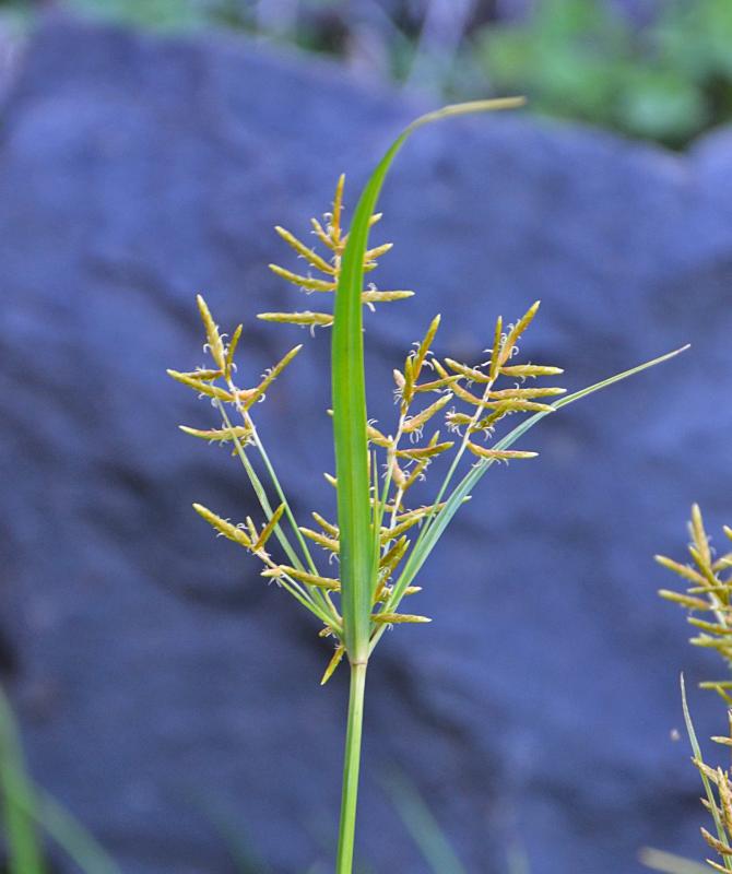 Sie wird bis ca. 60 cm hoch und gilt als eingeschleppt. Manchmal sorgt sie für Verwirrung, da sie – je nach Reifestadium – unterschiedliche Gesichter besitzt, nämlich ein frischgrünes oder ein weniger frischgrünes. Habe daher Fotos von einem jüngeren und einem älteren Exemplar angehängt. Ach ja, sie besitzt übrigens (wie alle Zypergräser) einen dreikantigen Stängel…