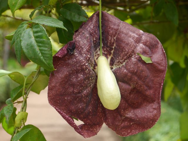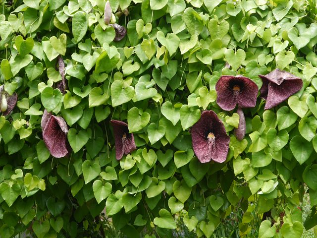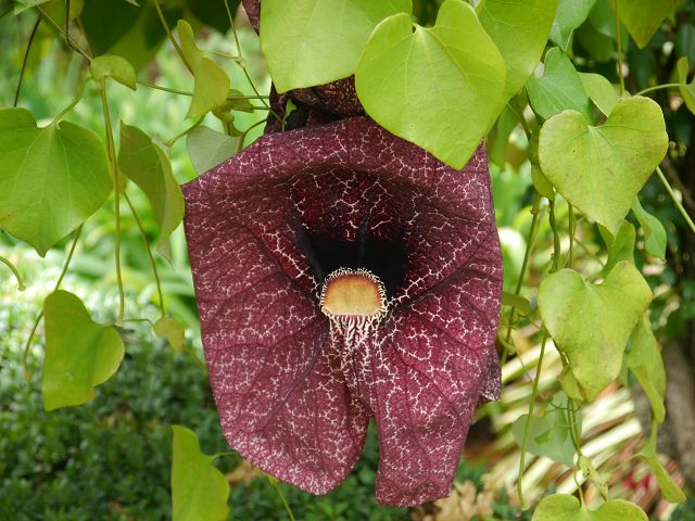 es scheint eine Aristolochia bzw. Pfeifenblume (auch: Osterluzei oder Gespensterpflanze) zu sein. wirklich sehr dekorativ, habe ich im Palheiro Garten ebenfalls abgelichtet