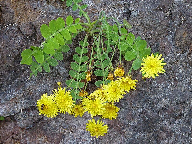 Ansonsten noch viele Arten, die hier im Forum schon genügend abgebildet wurden, wie z.B. Prächtiger Natternkopf oder die Aeonien, aber auch Arten die erst im Herbst blühen, wie z.B. die Zwerg-Gänsedistel (Sonchus ustulatus). Den deutschen Namen hat sich Her Velvet mal wieder selber ausgedacht, da er diese Art eigentlich ganz gut beschreibt. Im Gegensatz zu den beiden anderen endemischen Gänsedisteln hat er nämlich eher das Format eines "normalen" Löwenzahnes. Zur Vollständigkeit hier aber noch einmal ein Foto, das im Herbst an der Nordküste aufgenommen wurde. Auch diese Pflanze besitzt einen hohen Wiedererkennungswert und ist dem einen oder anderen sicher schon mal aufgefallen.