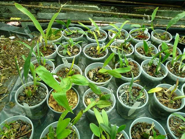 Herr Prof. Dr. Schön und seine zwei Gärtnerinnen tuen alles, damit es den Orchideen gut geht. Die mittelgroßen und großen Orchideen sind bereits umgetopft (in größere Blumentöpfe) und jede Pflanze bekam seine Spezialerde.