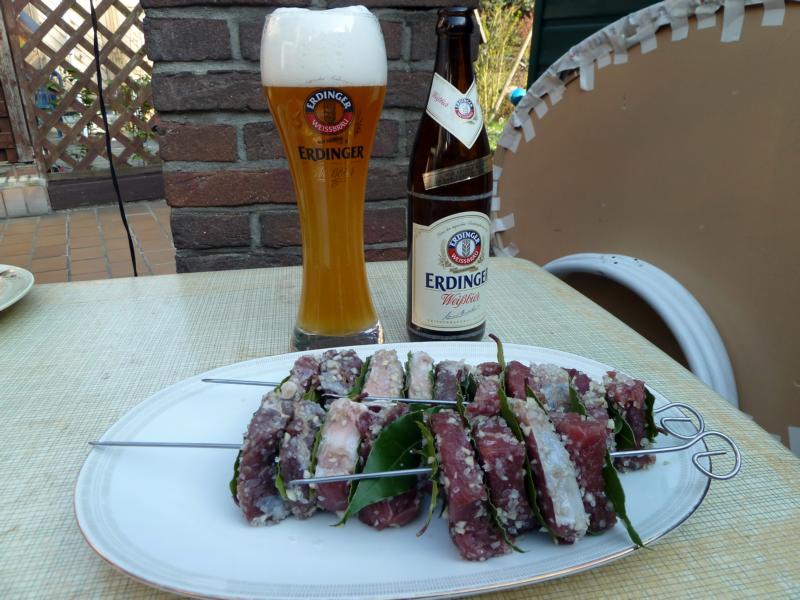 Hallo zusammen, heute gab es wieder die tollen Spieße. Die vom letzten mal übrig gebliebenen frischen Lorbeerblätter hatten wir bis heute in Öl eingelegt.