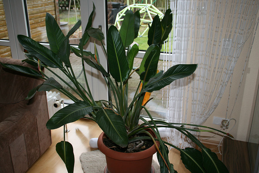 Boernie: Wenn das Frauchen sieht wird sie sagen: auch eine haben will.............. Och, kein Problem. Entgegen aller Unkenrufe hatten wir die Samen in der Markthalle in Funchal gekauft. Allerdings war das vor fast 15 jahren. Und so lange ist die Strelizie dann schon bei uns gewachsen.