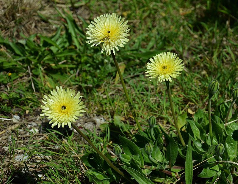 Der typische dunkle Bereich im Zentrum des Blütenstandes ist allerdings schon deutlich ausgebildet. Dieser dunkle Bereich wird auch noch etwas größer, wenn die dazugehörigen Blüten erst einmal alle aufgeblüht sind. Das Kleine Habichtskraut oder der in Deutschland heimische Bocksbart hingegen besitzen einen m.o.w. rein gelben Blütenstand.