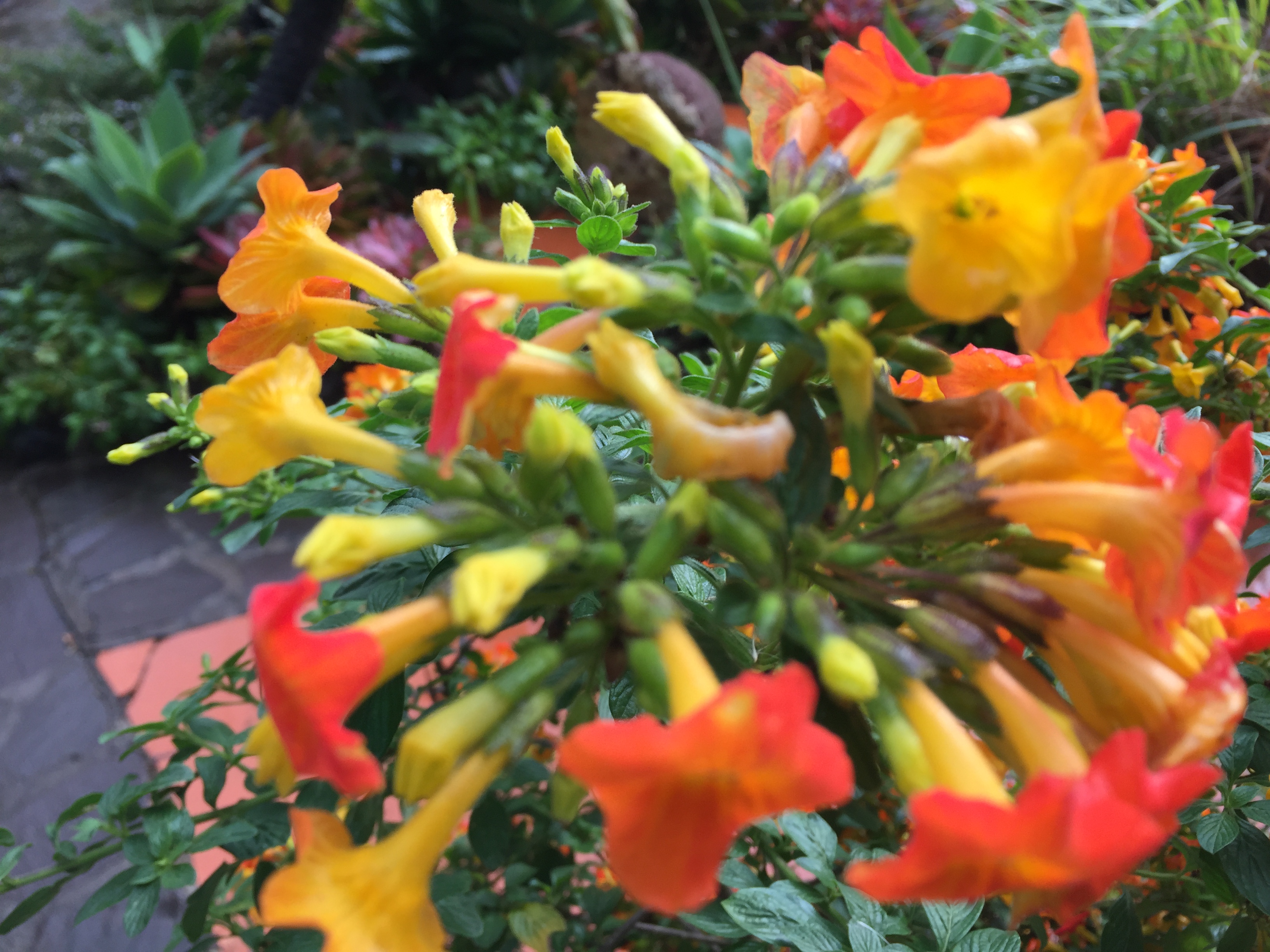 Ich galube es zwar nicht (es sei denn das Foto verzerrt oder es ist eine besonere Variante...) Aber die Blütenform erinnert an Lantana (Wandelröschen). Würde uach zum Farbwechsel passen. Auf den Azoren mittlerweile ein fiese Kraut.