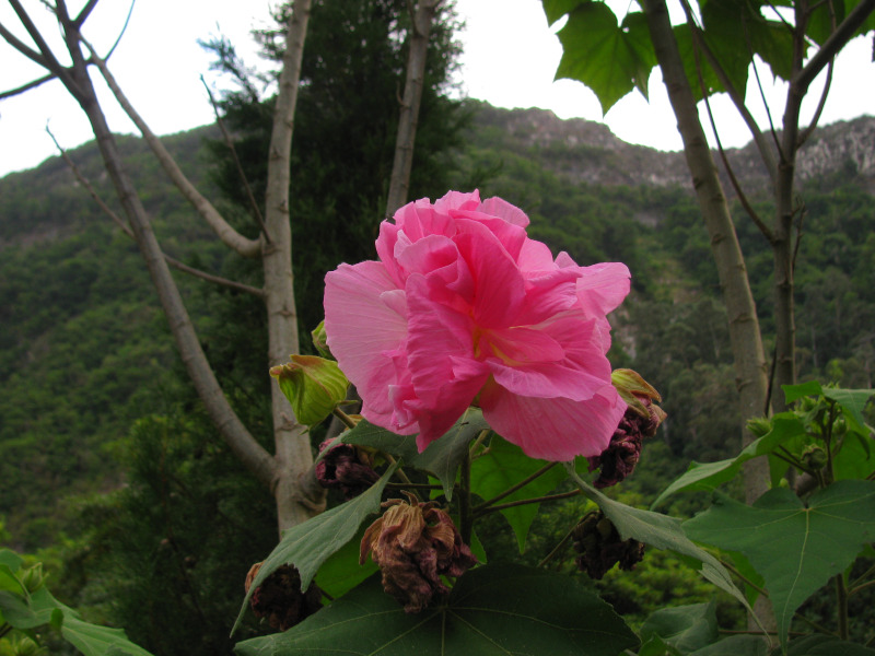 | hohe rosa blühende Zierpflanze ( Hibiskus?) (= gefüllte Schönmalve /Abutilon ) |