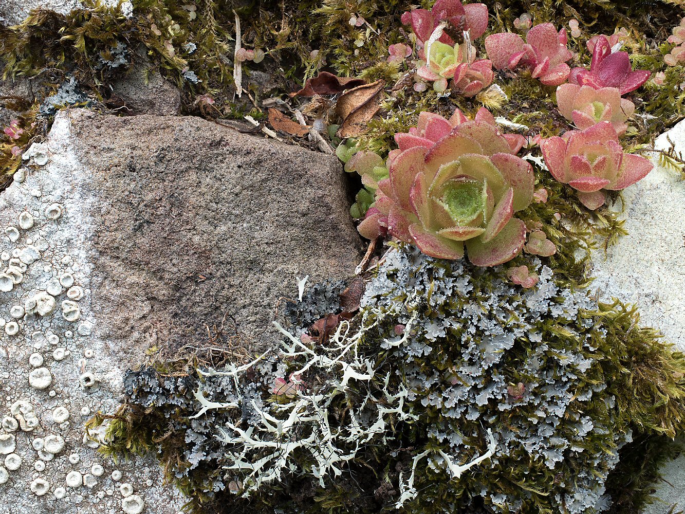 das war ja gleich ein Volltreffer. Danke für Eure Bestimmungen und interessanten Anmerkungen (vielleicht kommt ja bei Stachys sogar noch etwas nach). Am zweiten Tag haben wir (wegen reichlicher Flechtenausbeute) lange an der Boca do Risco zugebracht. Daher gibt es von dort auch mehr Pflanzenbilder. Das beigefügte Äonium war gewissermaßen nur Beifang zu den drei Flechten, sieht aber so hübsch aus, dass ich es hier zwecks genauerer Ansprache vorstelle. (Bei den Flechten tue ich mich leichter ).