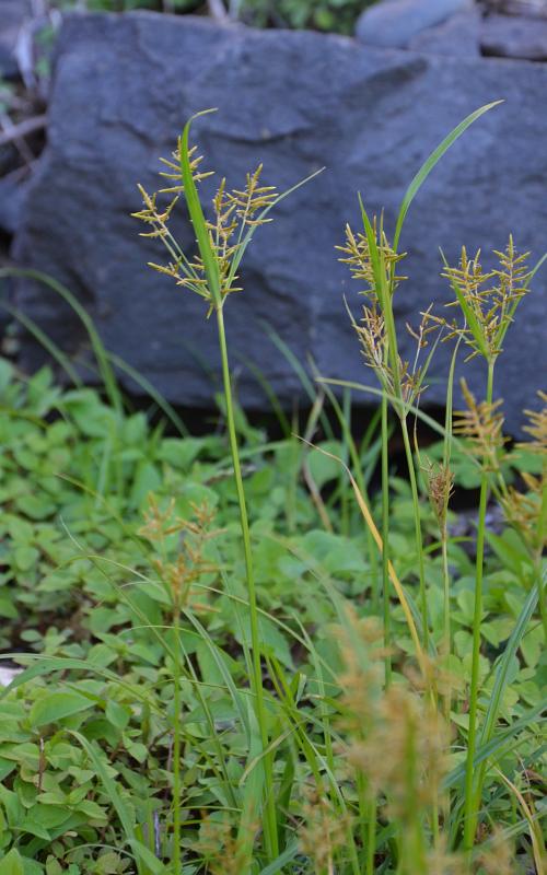 Sie wird bis ca. 60 cm hoch und gilt als eingeschleppt. Manchmal sorgt sie für Verwirrung, da sie – je nach Reifestadium – unterschiedliche Gesichter besitzt, nämlich ein frischgrünes oder ein weniger frischgrünes. Habe daher Fotos von einem jüngeren und einem älteren Exemplar angehängt. Ach ja, sie besitzt übrigens (wie alle Zypergräser) einen dreikantigen Stängel…