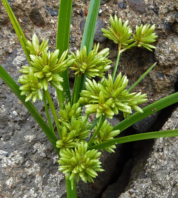 ich gehe mal davon aus, dass die Erdmandel mittlerweile verdaut und einigermaßen gesackt ist. Habe da nämlich noch das das Frischgrüne Zypergras (Cyperus eragrostis). Diese Art wächst ebenfalls in der „Kulturzone“, allerdings nicht als Unkraut in Äckern und Gärten, sondern mehr an Gewässerrändern wie z.B. Bewässerungsgräben oder auch in Rinnsteinen an kleineren Straßen. Allerdings ist sie bei weitem nicht so häufig wie die Erdmandel und nach eigenen Beobachtungen vorwiegend im Südteil der Insel zu finden.