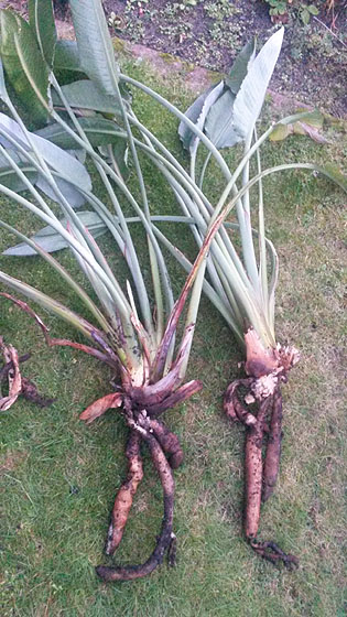 ermutigt durch Dich, Tatanka, hatten wir es Ende Oktober gewagt, unsere Riesenstrelizie im zu kleinen Topf zu teilen. Der Topf bestand nur noch aus Wurzeln.