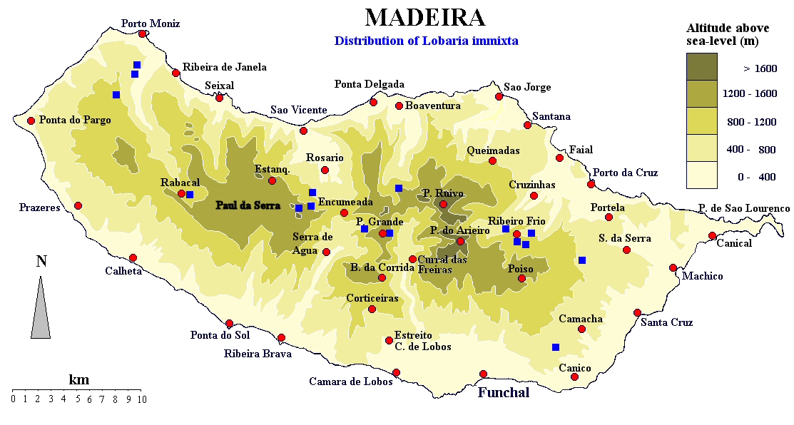 Zwar war ich bereits mehrmals südlich von Seixal, an jenem Ort, wo die Ribeira aus dem Lorbeerwald kommt (und immer war es dort flechtenreich und regnerisch ) - aber Lobaria immixta habe ich dort weder fotografiert noch gesammelt (siehe die Karte meiner Fundorte dieser Species):