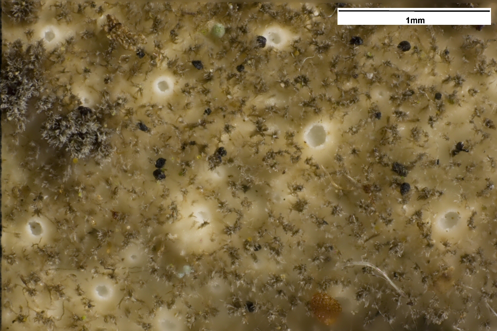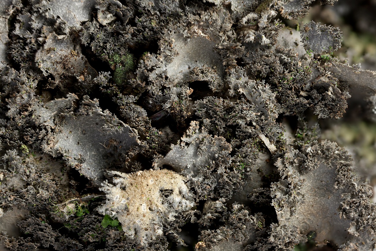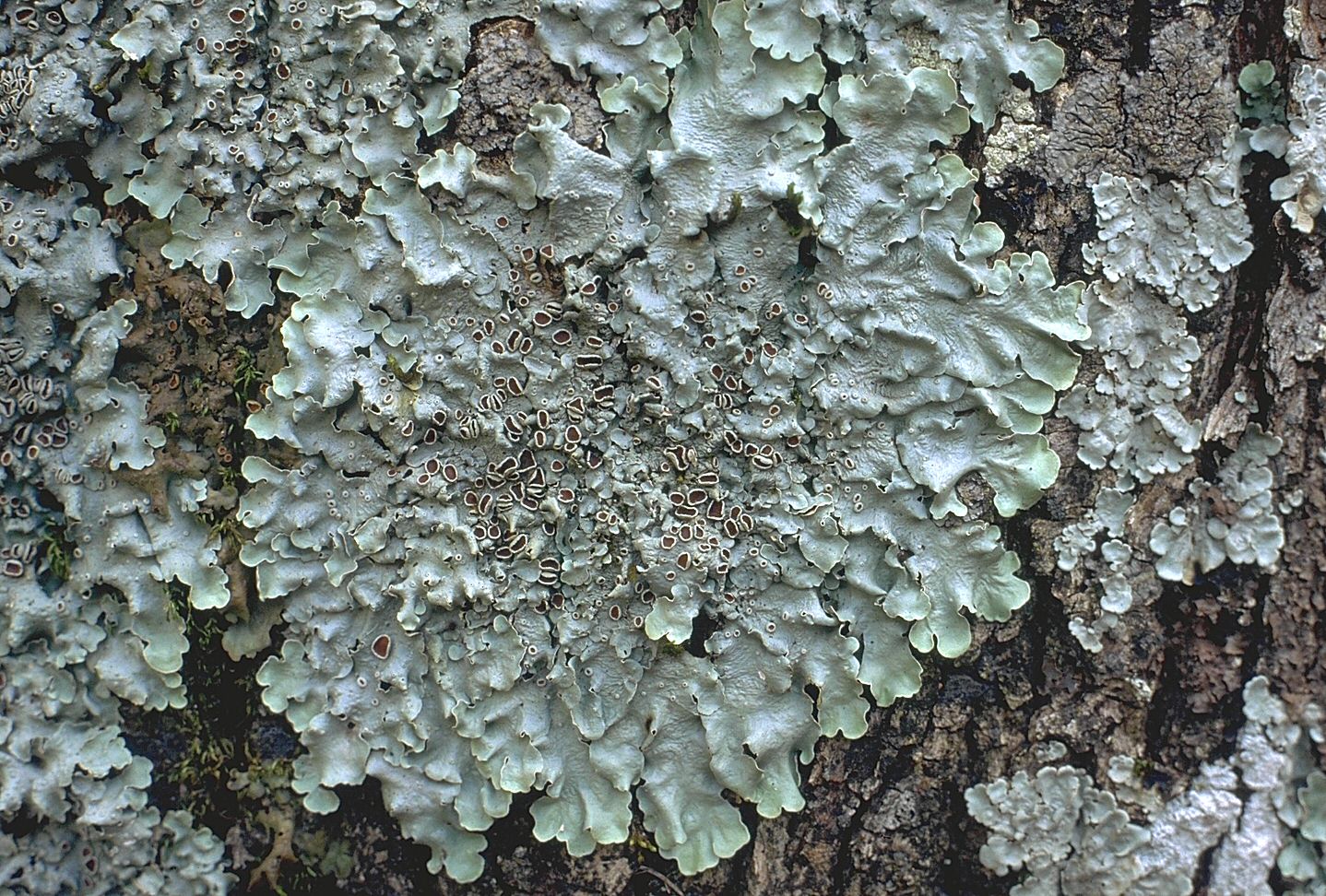 Zwar ist Flechtenbestimmung nach Bildern noch wesentlich heikler als bei Pflanzen; dennoch glaube, ich diese Art zu kennen (auch wenn Du sie ziemlich ausgetrocknet fotografiert hast). Ich behaupte, Deine Blatt-Flechte (die ich übrigens als nächste vorstellen will, weil sie in der Tat ebenfalls sehr häufig anzutreffen und groß ist), besitzt auf der Unterseite weißliche, runde, scharf umgrenzte "Löcher", die aussehen, als hätte jemand mit Schrot darauf geschossen (siehe extreme Makroaufnahme von der Unterseite). Am besten sieht man das mit einer Leuchtlupe (die Du als Botaniker sicher besitzen wirst). Diese "Einschüsse" heißen Cyphellen und dienen der Verbesserung des Gasauastausches. Sie sind ein sicheres Zeichen, dass die Flechte nicht zur Gattung Lobaria gehört. Ein weiteres , charakteristisches Merkmal ist die dichotome (gabelige) Verzweigung an den Lappenenden (die bei Deinem Ausschnitt nicht sehr gut zu sehen ist). Mehr verrate ich jetzt noch nicht.