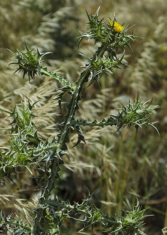 Neben der Wilden Artischocke (Canara cardunculus), die allerdings erst später im Jahr blüht (vereinzelt waren aber schon blaue Tupfer im Gras zu sehen), gibt es auf der Halbinsel noch ein weiteres, recht hartstacheliges Gewächs. Der Gefleckten Golddistel (Scolymus maculatus) sollte man jedenfalls nicht zu Nahe treten, da sie ziemlich bissig werden kann.