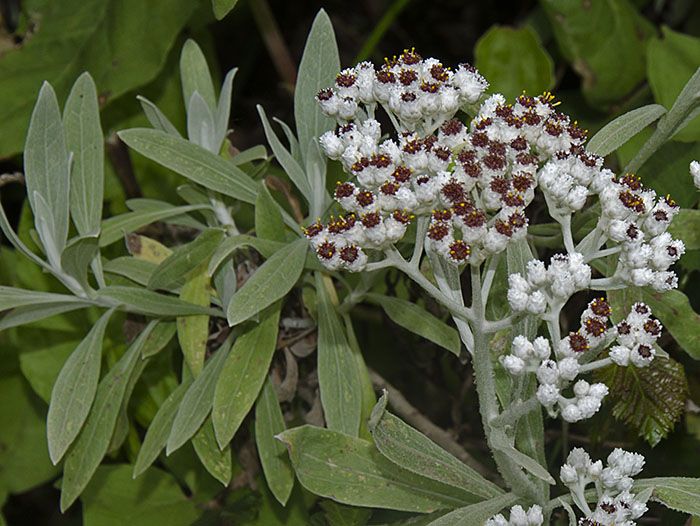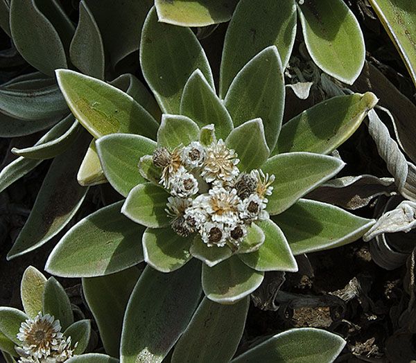 Seltener ist die (auf dem Foto leider schon fast verblühte) Lourenco-Strohblume (Helichrysum devium), die der Schwarzaugen-Strohblume (Helichrysum melaleucum) ähnelt.