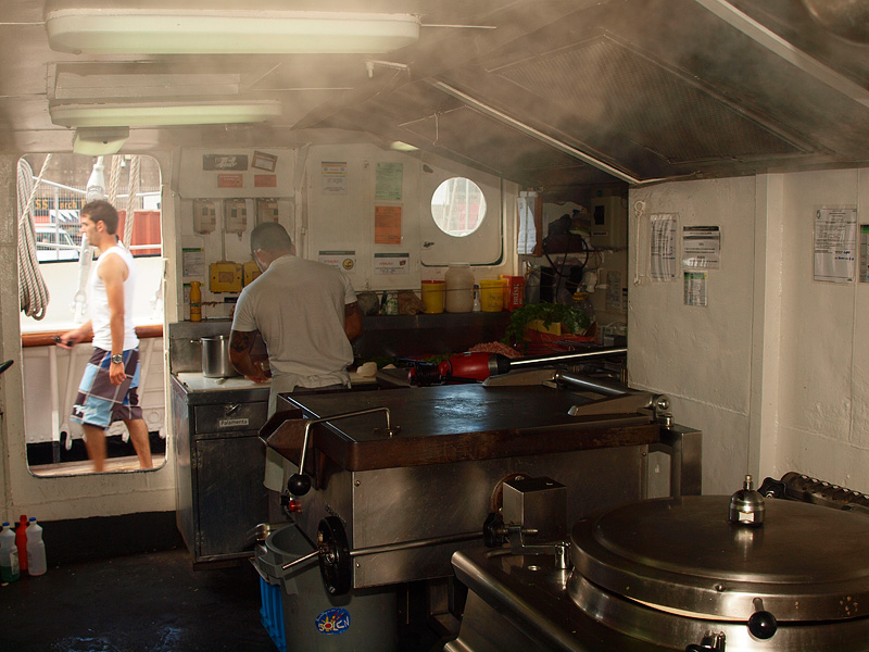 Die diensthabende Besatzung war sehr freundlich und hat geduldig alle Fragen beantwortet und Auskünfte erteilt. Nur was es zum Abendessen geben sollte, wollte uns der Schiffskoch partout nicht verraten.
